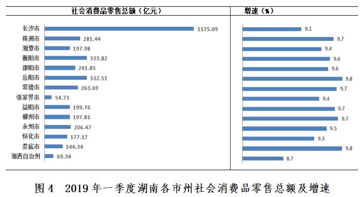 2、增速最快与最慢。岳阳市、娄底市以9.8%的社会消费品零售总额增速并列全省首位,湘西自治州8.7%的增速为全省最低,其余市州增速均在9.0%以上。