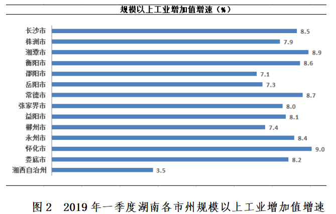 2、增长加快与回落。与2018年一季度相比,张家界市、怀化市规模以上工业增加值增速上涨最多,分别提高了4.0和3.2个百分点;全省共有7个市州增速上升1个百分点及以上。邵阳市和郴州市规模工业增速分别下降0.3和0.5个百分点。