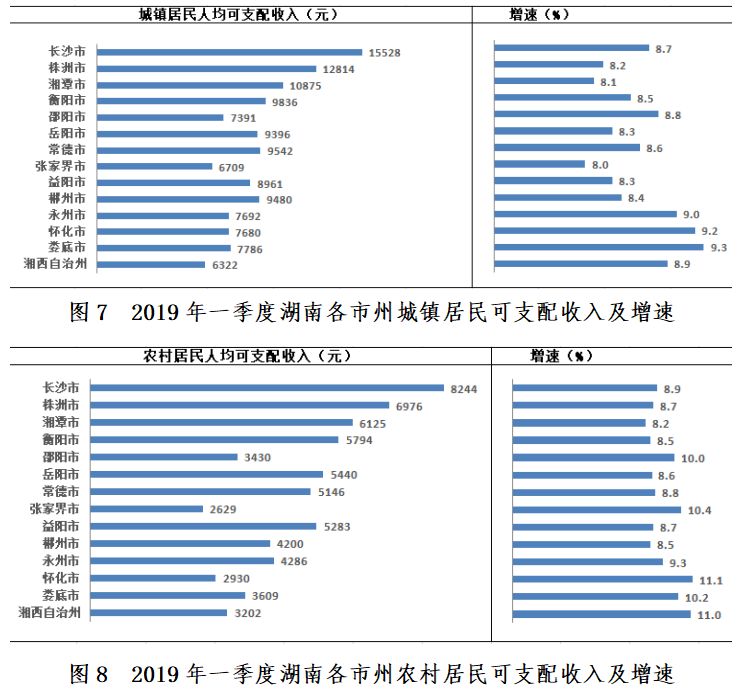 3、市州间收入差距持续缩小。2019年一季度,城镇居民人均可支配收入最高的长沙市和最低的湘西自治州的倍差与上年同期基本持平,为2.46:1;农村居民人均可支配收入最高的长沙市和最低的湘西自治州的倍差由上年同期3.18:1小幅下降至3.14:1。