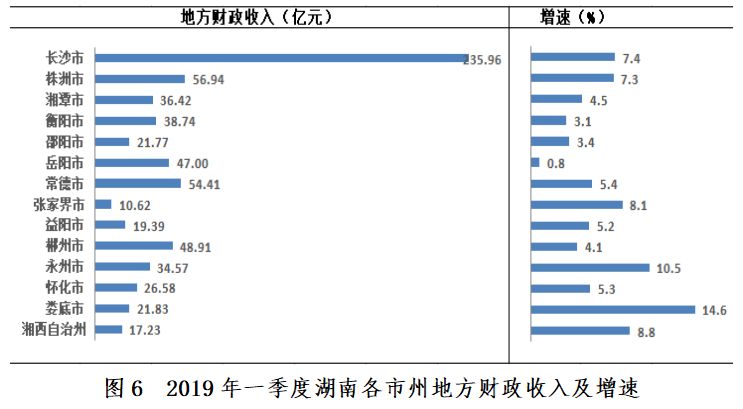 2、增速最快与最慢。娄底市、永州市和湘西自治州地方财政收入增速居全省前三,分别增长14.6%、10.5%和8.8%;岳阳市以0.8%的增速为全省最慢。