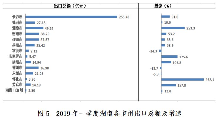 3、一半市州增速出现回落。与2018年一季度相比,7个市州出口增速下降,其中岳阳市和张家界市下降177.3和105.4个百分点,其余5个市州的降幅在5.9—75.4个百分点之间。