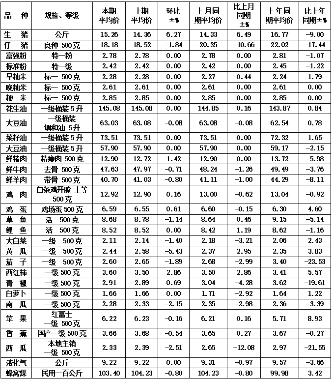 液化气、蜂窝煤集市平均价格分别为每公斤9.22元、每百公斤103.40元,较上期分别持平、下跌0.80%;较上月同期分别下跌0.97%、0.80%;较上年同期分别下跌3.66%、上涨3.42%。