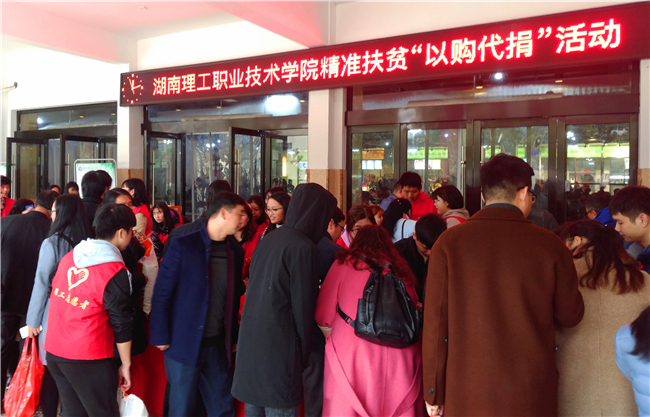 12月3日,湖南理工职业技术学院精准扶贫“以购代捐”活动在我校博爱楼拉开帷幕。学校党委书记叶星成、校长杨爱云等校领导以身示范,率先订购,带动全校教职员工积极参与、踊跃抢购。