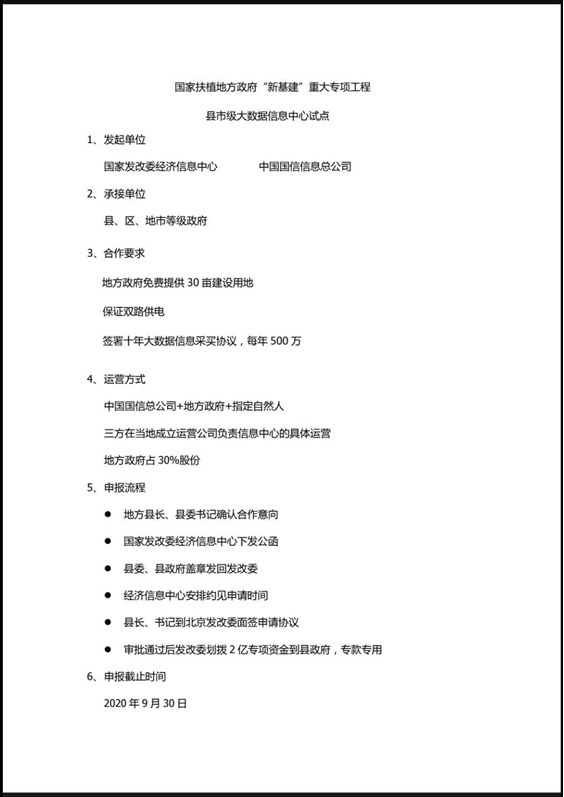 近日部分县市收到了关于《国家扶植地方政府“新基建”重大专项工程县市级大数据信息中心试点》的通知,发起单位为“国家发改委经济信息中心”和“中国国信信息总公司”。经我委咨询国家发改委、国家信息中心及中国国信信息总公司,已证实该通知为不实通知,请你们提高警惕,并及时告知县市区负责同志,以免造成损失。