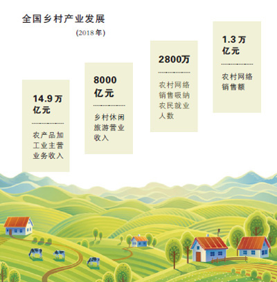 本报北京7月1日电 (记者王浩)产业兴旺是乡村振兴的基础,是解决农村问题的前提。党的十八大以来,乡村产业呈现良好发展势头。2018年,粮食产能连续7年保持在1.2万亿斤以上,农产品加工业主营业务收入达14.9万亿元,乡村休闲旅游营业收入超过8000亿元,农业生产性服务业营业收入超过2000亿元,农村网络销售额1.3万亿元,返乡下乡创新创业人员累计达780万。