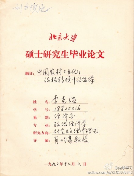 在博士论文《论我国经济的三元结构》中,李克强开宗明义写道:“迄今为止,世界上众多国家的经济发展历程表明,现代化的实质就是实现由传统农业向现代工业社会的演化,由农业国变成工业国。因此,一个国家在走向现代化的进程中,首先必须实行工业化。”