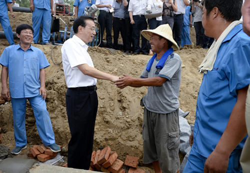 2014年10月24日,李克强总理在山东德州雨污分流管道铺设施工现场与农民工握手交谈。