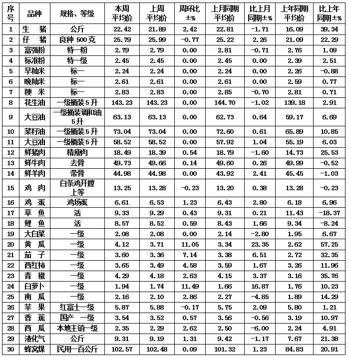 据监测,本周我省重要民生商品价格总体平稳,其中生猪、鲜猪肉、牛肉、蛋、鱼价格略涨,蔬菜价格整体上涨,仔猪、鸡肉价格小幅下跌,具体情况如下: