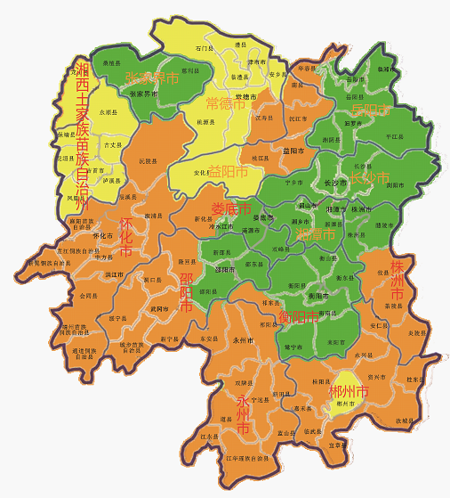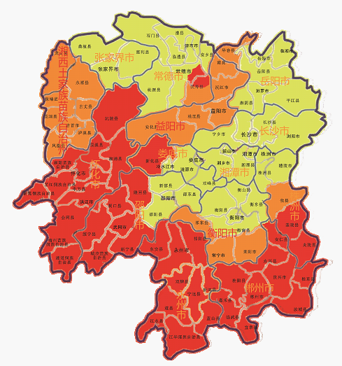怀化市,永州市,郴州市,邵阳市绥宁县、城步县、洞口县、武冈市、新宁县、隆回县,娄底市新化县,株洲市炎陵县、茶陵县,常德市鼎城区、汉寿县北部 |